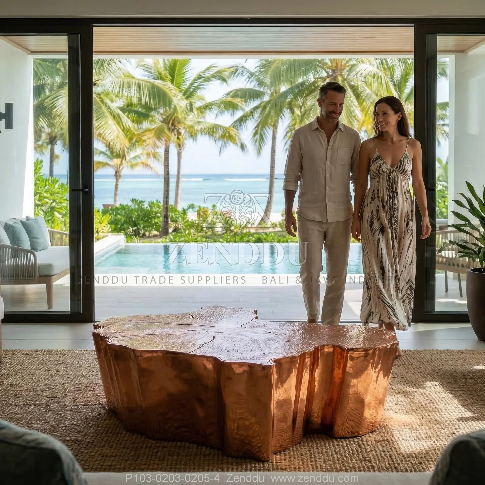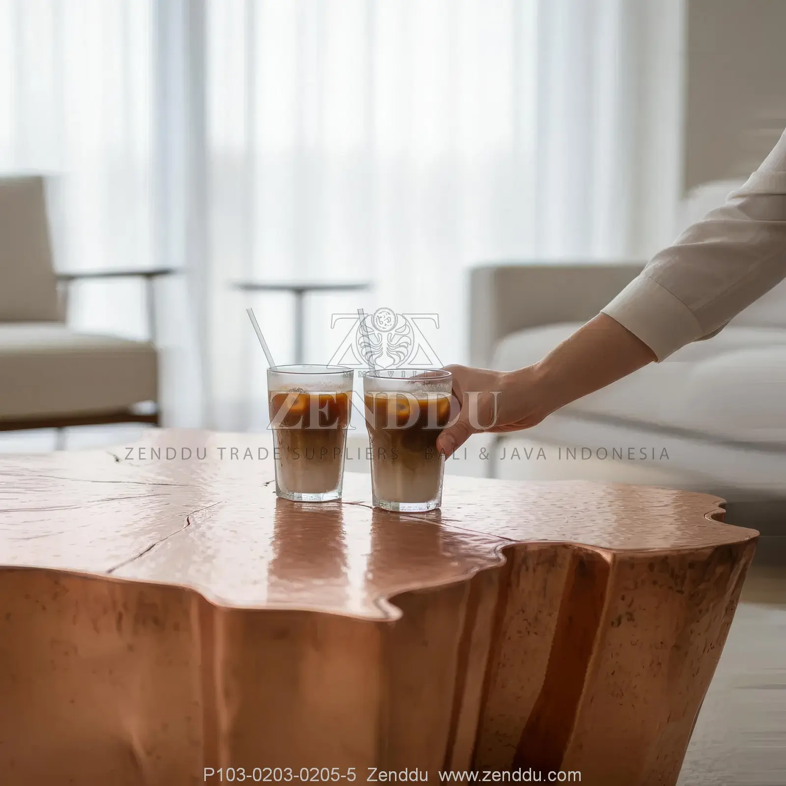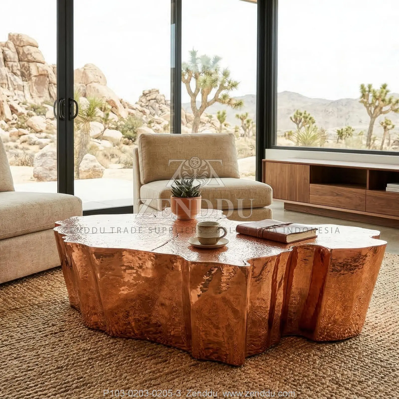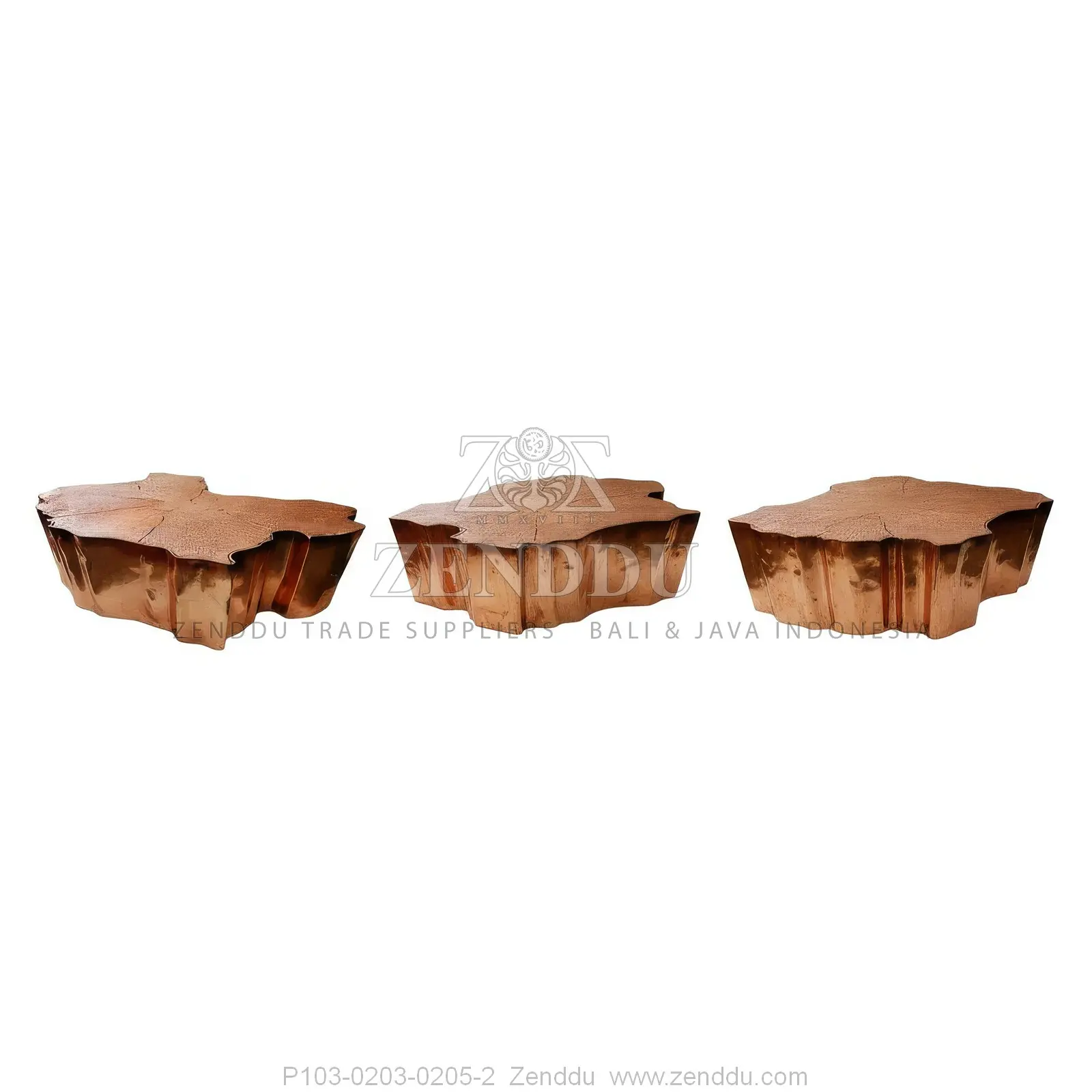 (Coffee Table) (For indoor use or covered outdoor area only) Material: Metal: (Copper), Location: Java