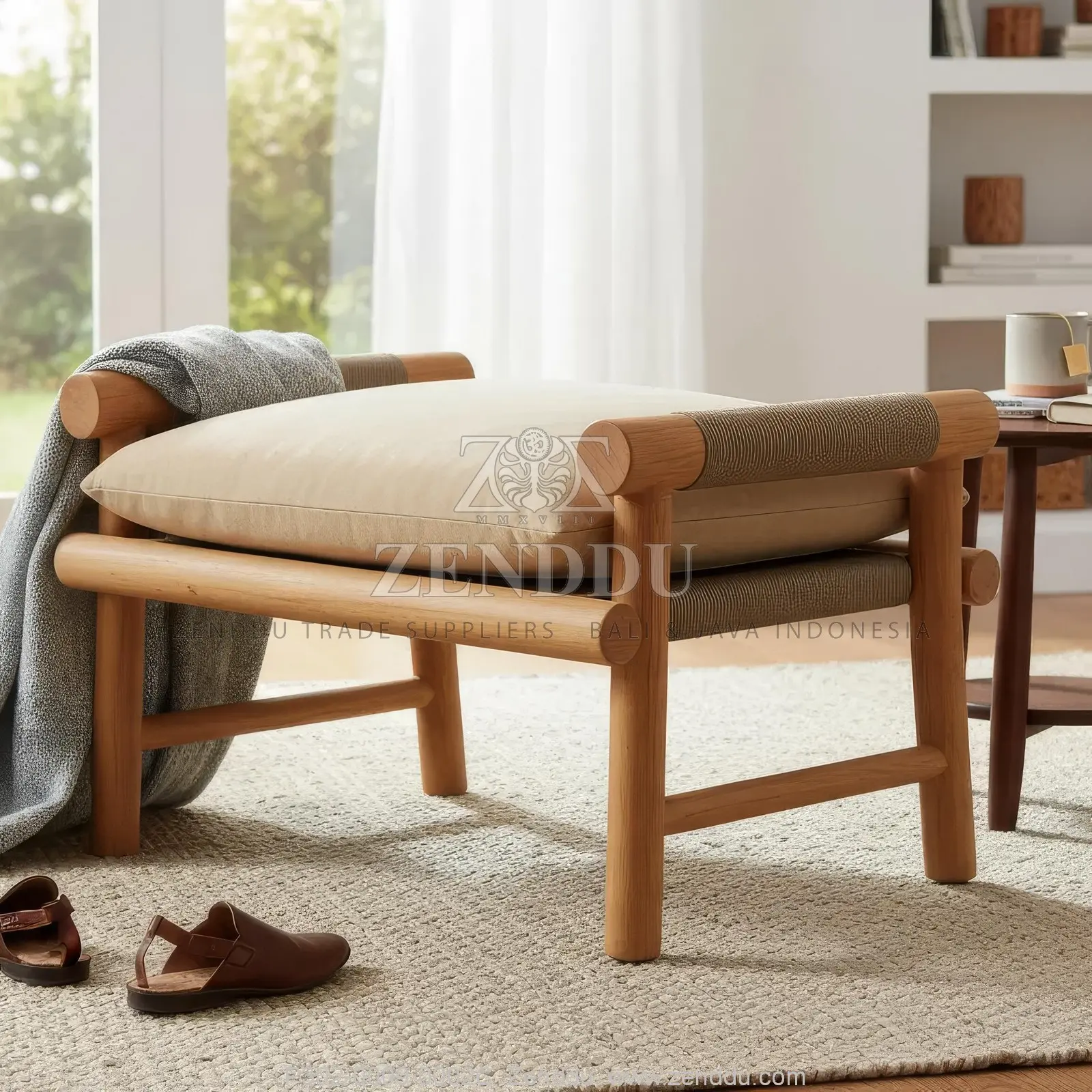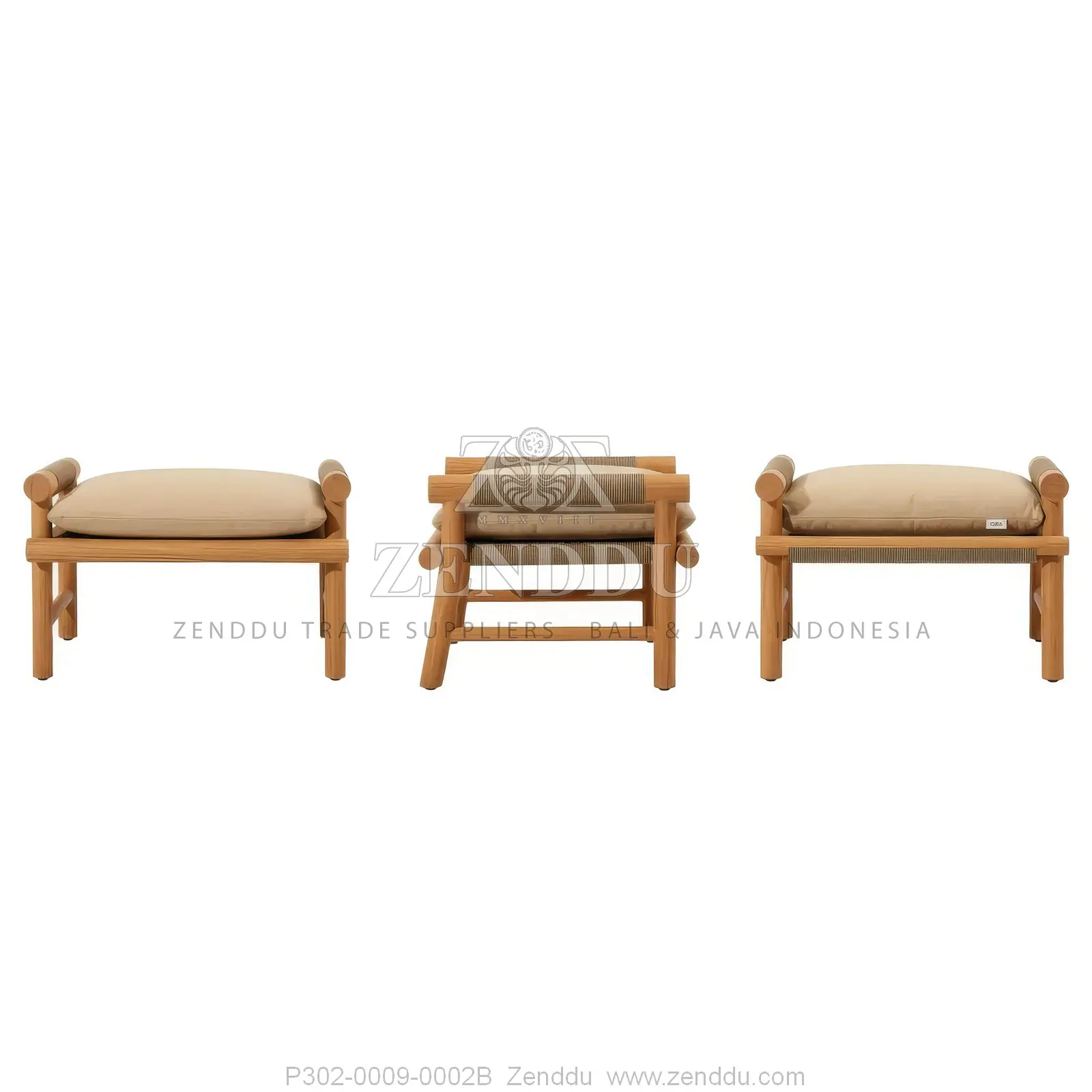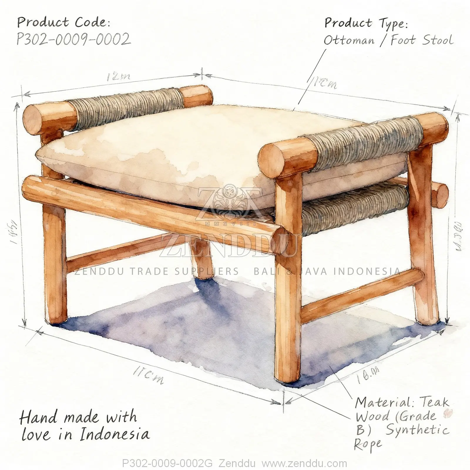 (Ottoman / Foot Stool) Material: Wood: (Teak wood Grade B - Kiln Dried, SVLK verified), Synthetic: (Synthetic Rope), Fabric: (Fabric Range: A), Foam: (Standard Foam) Location: Java
