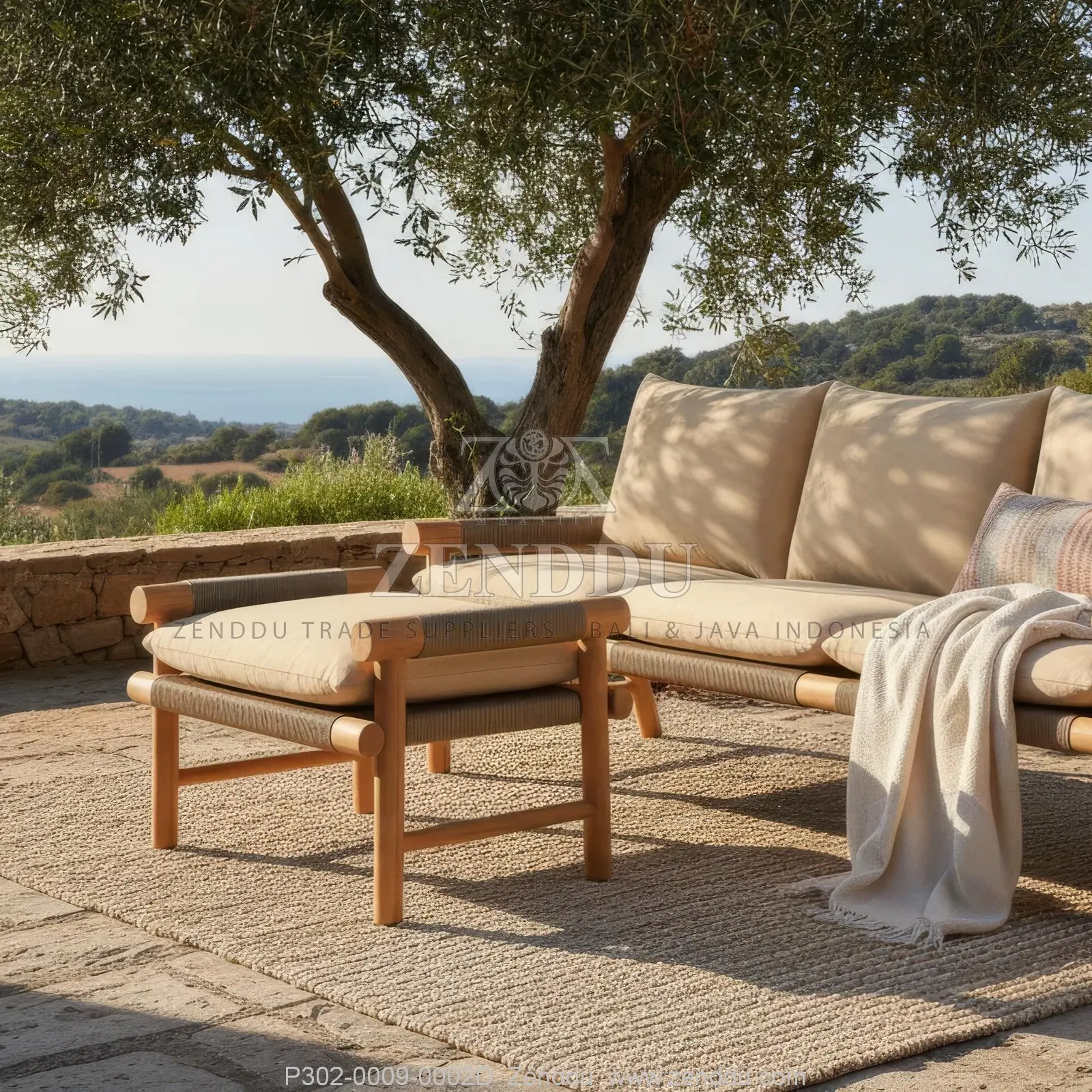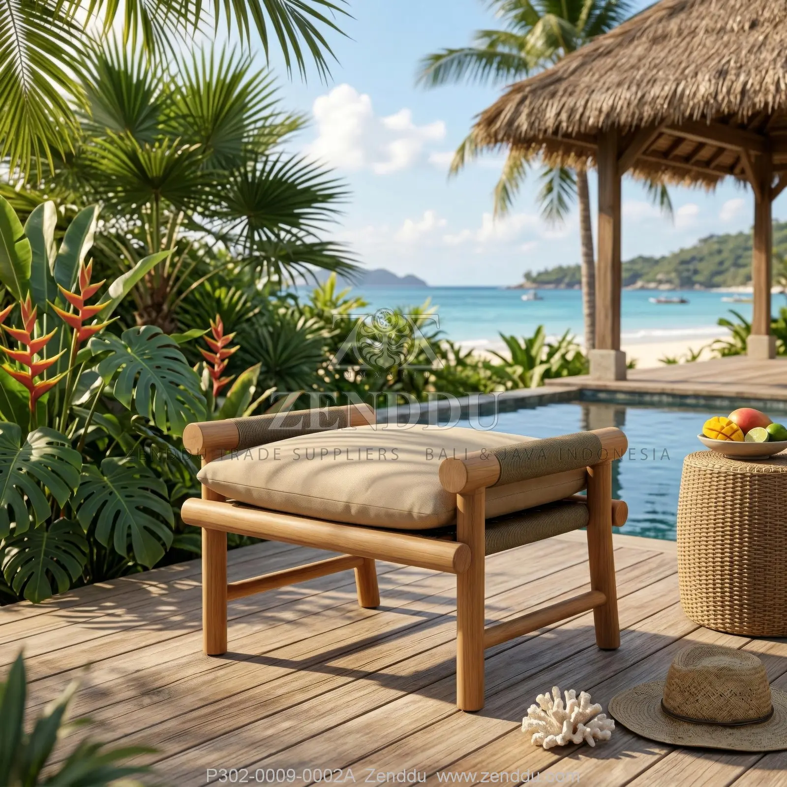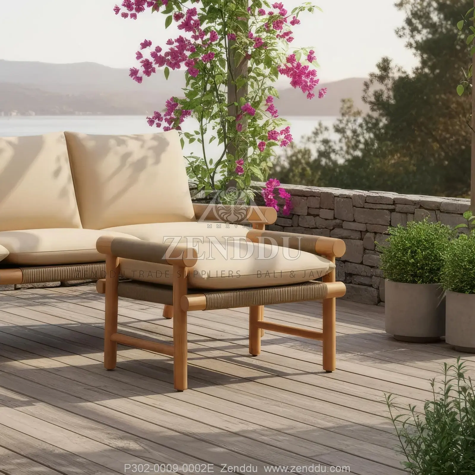 (Ottoman / Foot Stool) Material: Wood: (Teak wood Grade B - Kiln Dried, SVLK verified), Synthetic: (Synthetic Rope), Fabric: (Fabric Range: A), Foam: (Standard Foam) Location: Java